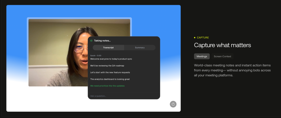 高保真捕获意味着 Highlight 将演变成一个始终在线的存在,通过屏幕捕获、音频转录和索引来跟随你的工作流程,将人机交互转化为语义数据,同时完全由用户控制隐私。用户可以选择捕获什么内容、何时分享。这解决了一个关键问题:如何在保护隐私的前提下,完整记录工作过程中产生的知识。
