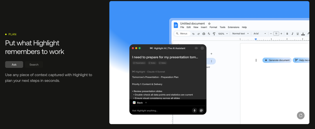 Highlight AI 试图改变这种模式,从手动提示转向主动协助。因为它理解整个团队的工作上下文,知道正在发生什么、谁在做什么、下一步需要做什么,所以它可以在你需要之前就采取行动。会议结束后,后续任务已经被起草好了,不需要你手动创建。文档需要更新时,AI 已经准备好了更新内容,等待你的审阅。