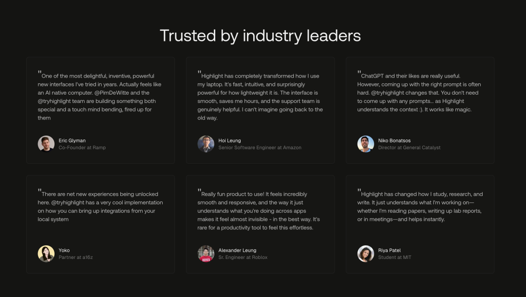 Highlight AI 在团队构建上的策略也很有意思。他们计划用这轮融资将团队规模扩大一倍,重点在旧金山招聘工程师、运营人员和营销人员,以加速产品开发和市场推广。但更重要的是他们对团队背景的选择。
