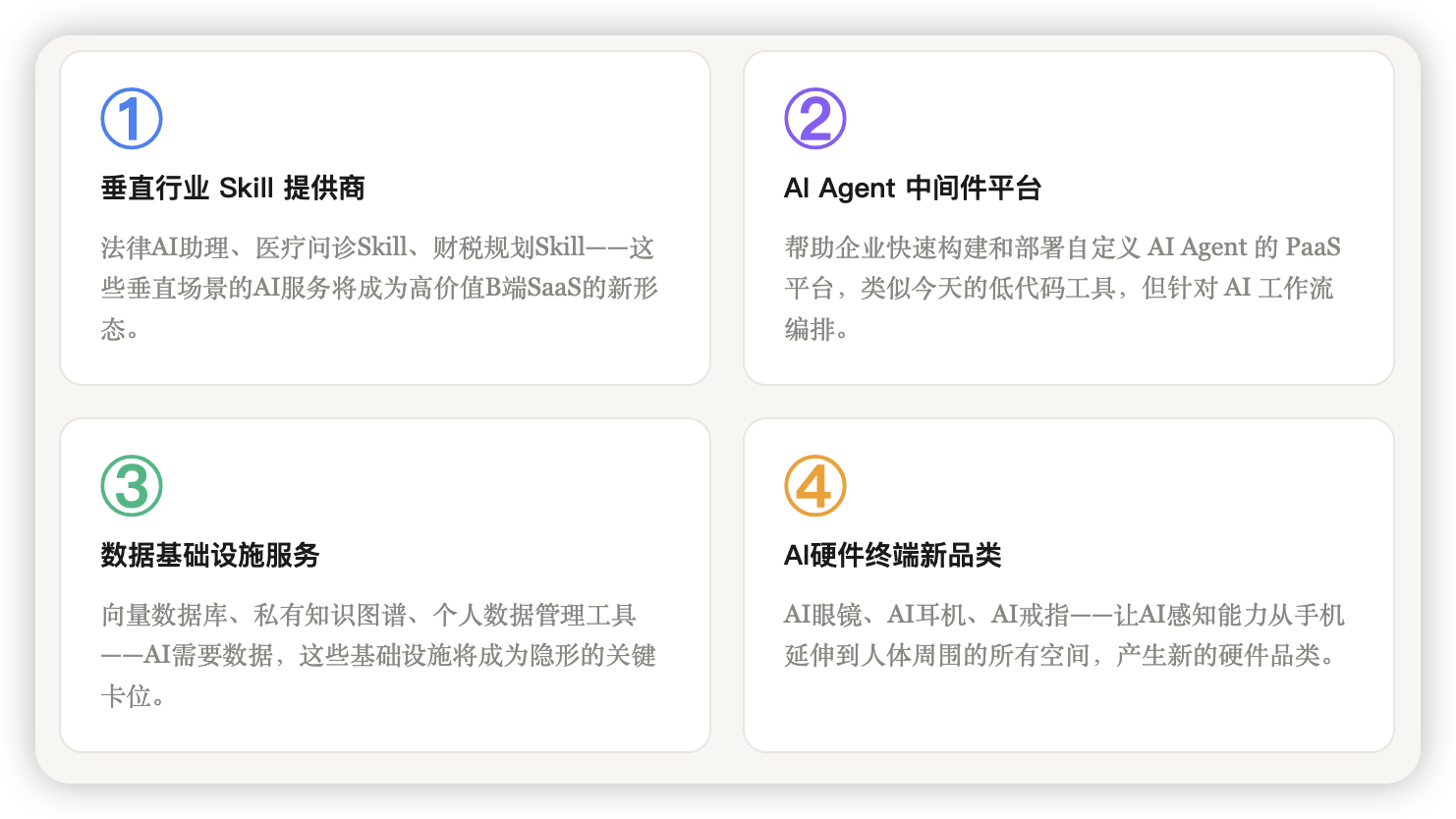 如果AI助理是新时代的”操作系统”,那么 Skills(技能插件)就是新时代的”App Store”。每一个垂直场景(医疗、法律、财税、旅行……)都会孕育出专业的AI Skill,通过平台进行分发和变现。
