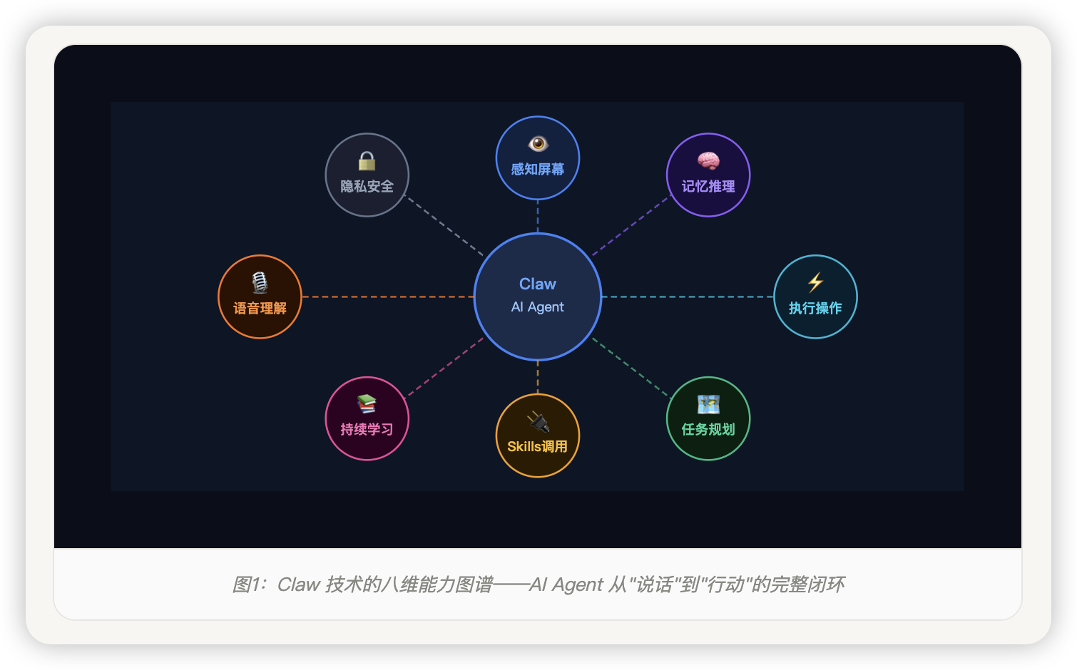 图1:Claw 技术的八维能力图谱——AI Agent 从”说话”到”行动”的完整闭环