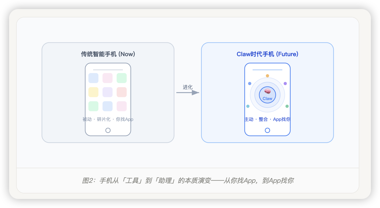 图2:手机从「工具」到「助理」的本质演变——从你找App,到App找你