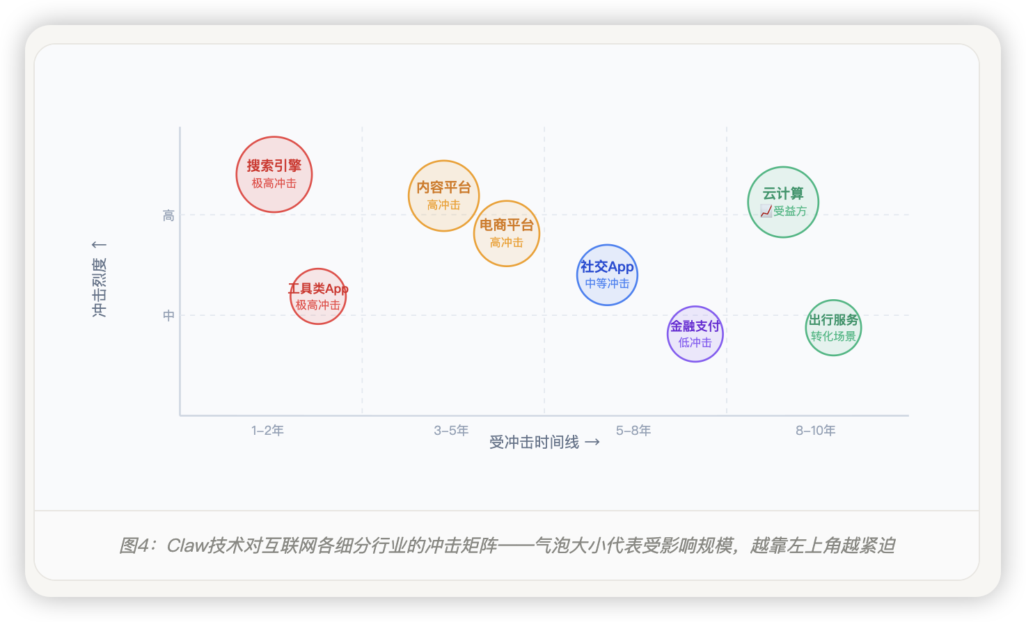 图4:Claw技术对互联网各细分行业的冲击矩阵——气泡大小代表受影响规模,越靠左上角越紧迫
