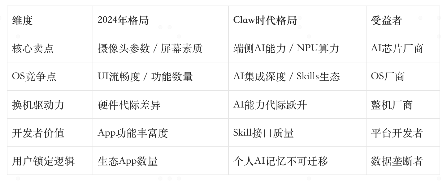 ⚠️ 危机预判:传统手机厂商中,那些没有自研芯片能力、缺乏AI软件积累、只靠硬件堆料的玩家,将在未来3-5年内面临严峻的市场淘汰压力。手机行业将迎来一次”AI鸿沟”式的市场集中——强者更强,弱者出局。