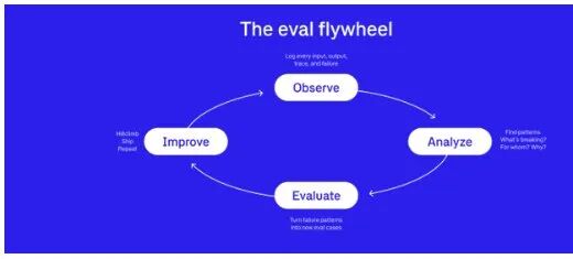 Eval 飞轮的四个阶段:Observe → Analyze → Evaluate → Improve,不断循环加速
