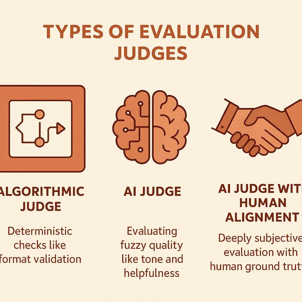 Eval 的核心组件之一是 judge——谁来判断 AI 的输出好不好。文章把 judge 分成三类: