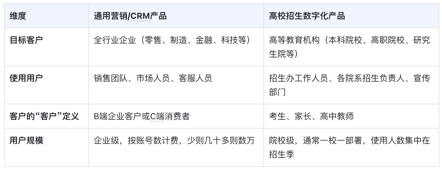 高校招生数字化产品与通用营销/CRM产品虽同属“客户关系管理”范畴,但如同一位主治医生和一位兽医——都要看病,面对的病人和诊疗逻辑截然不同。以下从六个维度逐一拆解。