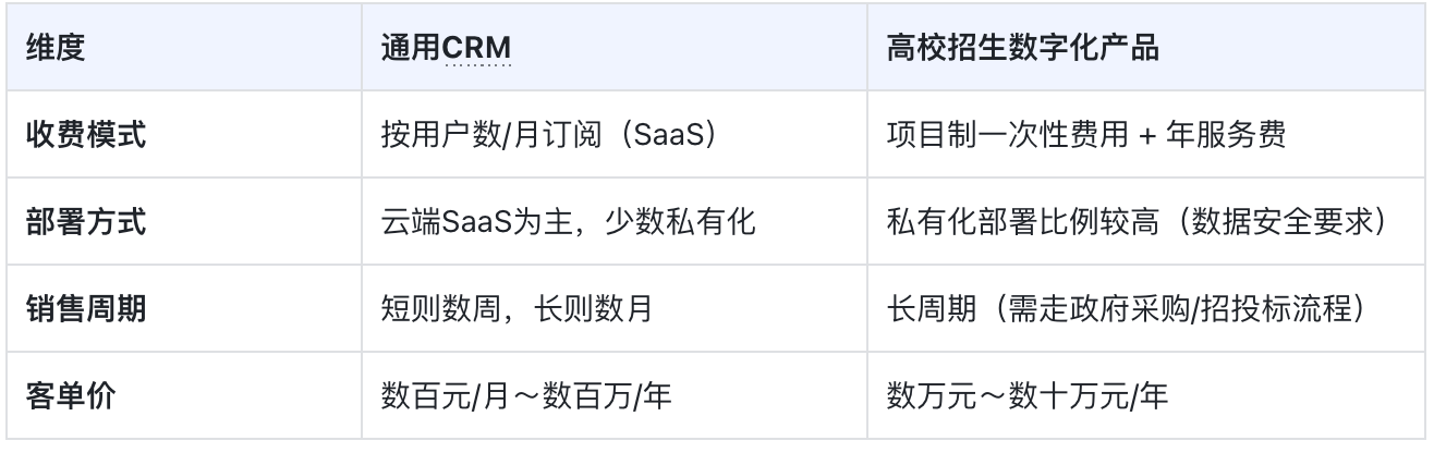 通用CRM如Salesforce、HubSpot、纷享销客等服务于全行业企业,按账号数向企业收费。高校招生数字化产品的客户是高校,使用用户是招生办人员、学生、家长,目标院校数量有限但单客价值较高,通常以项目制或年费制交付。