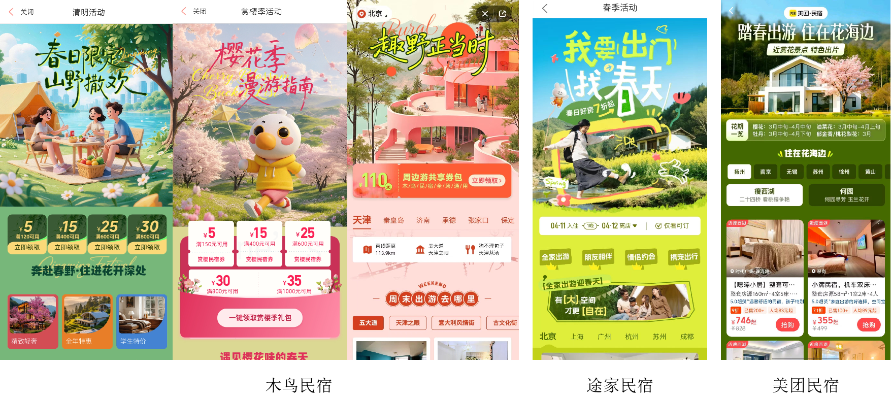 从木鸟民宿“春日山野”“樱花季”“趣野周边游”三个专题活动,到途家民宿的“出门找春天”,再到美团民宿的“赏花专题”,三大平台将用户的注意力焦点一次又一次拉回到春游活动中来。