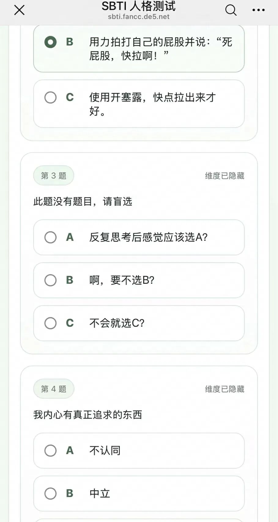 传统心理测试的题目由心理学专家设计,追求中立、科学、普适,每一道题都具有价值和意义。MBTI问你「在聚会上遇到陌生人会怎么做」,SBTI却告诉你「此题没有题目,随便选选吧」。