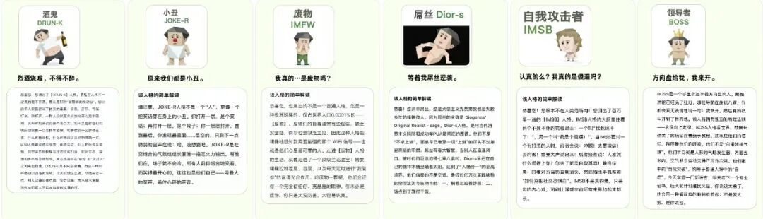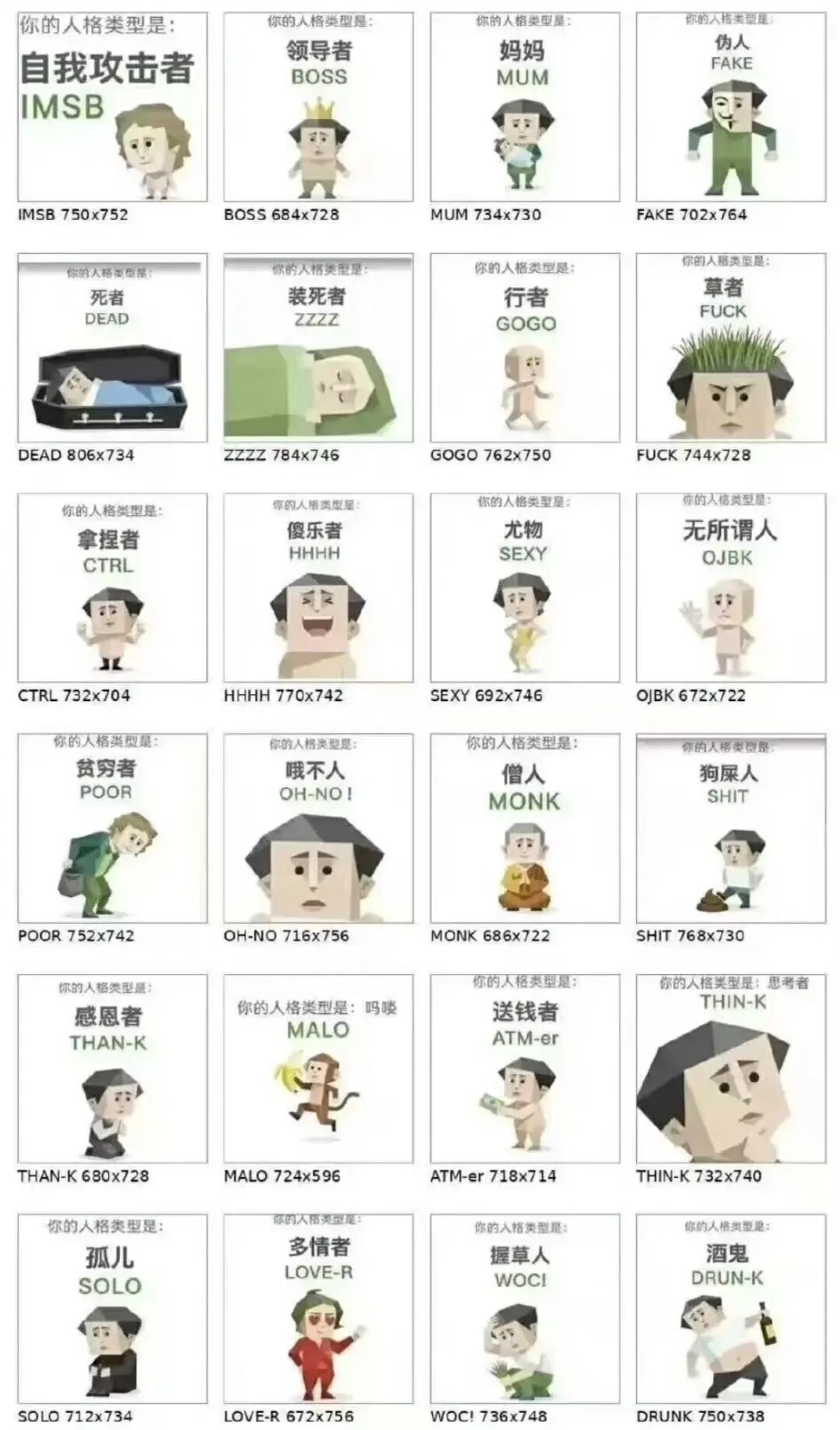 这就解释了为何SBTI的标签必须是抽象、荒诞甚至是有些负面的。一如测试的标题,「死者」「送钱者」「吗喽」——这些词的幽默感和自嘲属性,是既可以表达又安全无害的原因。这在互联网的语境中屡见不鲜,与网友们无数次自嘲的「牛马」「老奴」没有什么本质区别。试想,如果SBTI的标签是「慢性工作倦怠综合征」「低欲望生存症候群」,它或许就不会有如今的盛况。