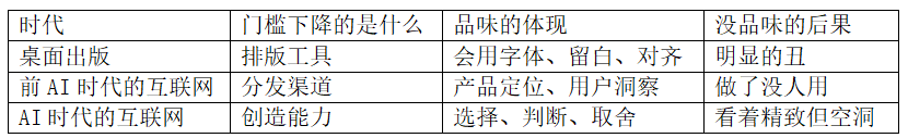 品味从”加分项”变成了”准入门槛”。以前没品味,产品丑但还能用;现在没品味,产品好看但没人记住你。