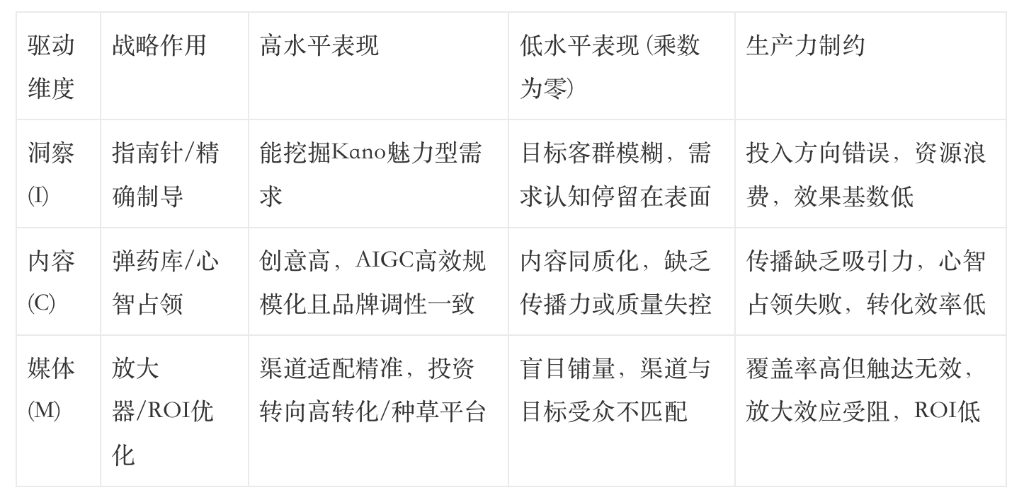 营销生产力的最终效能取决于其最薄弱的环节。在乘法关系中,任一要素的缺失或短板,都会限制整体效能,使最终产出趋近于零。如果洞察存在偏差,即使内容制作精美,媒体投放预算巨大,最终产出仍是无效的资源浪费。