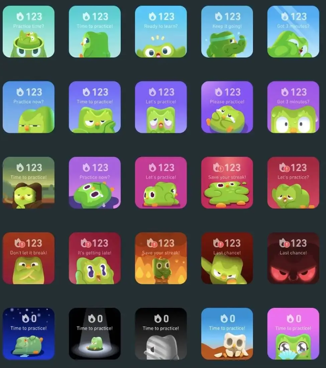 - 损失厌恶设计: 连续登录的“学习连胜”机制(中断后图标从奋斗鸟变为融化小鸟),使中国用户日均打开频次达4.2次,远超行业平均的2.7次。