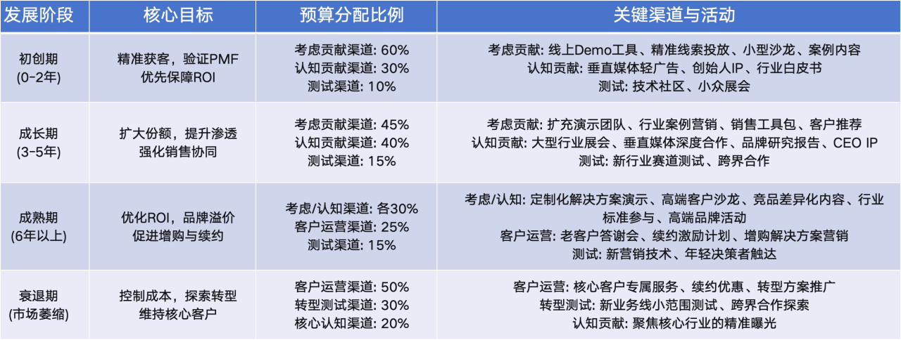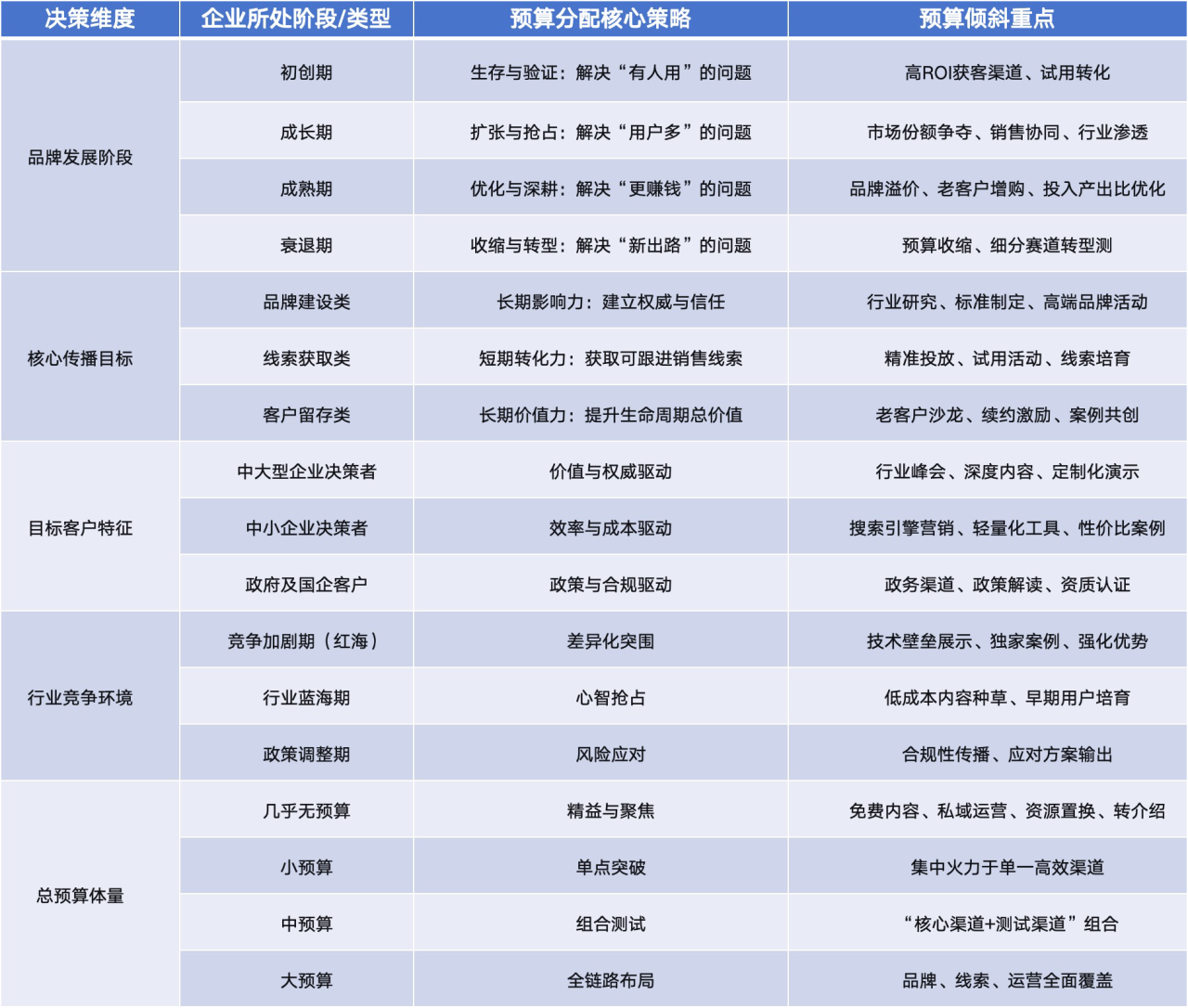 To B软件的预算分配需要围绕“品牌发展阶段”、“核心传播目标”、“目标客户特征”、“行业竞争环境”、“总体预算体量”这五大核心变量展开。脱离企业实际场景地去套用标准化公式,只会导致预算浪费或战略失焦。