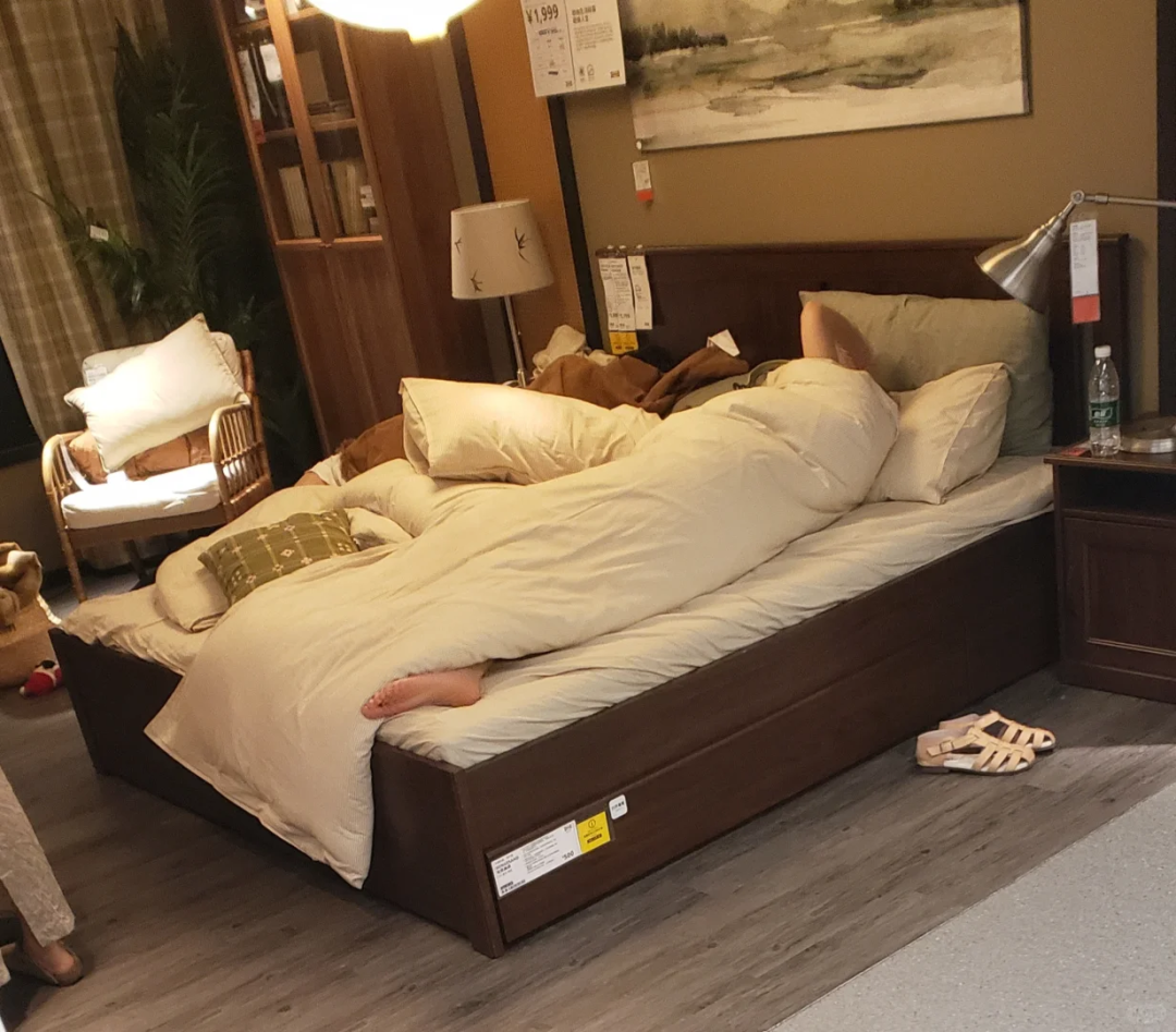 几乎每一个去过宜家的人,都见过这样一幕。样板间的床上,躺着睡得很香的陌生人。有人蜷着身子,有人抱着枕头,有人干脆把鞋脱在床边,像是在别人家里午睡一样自然。