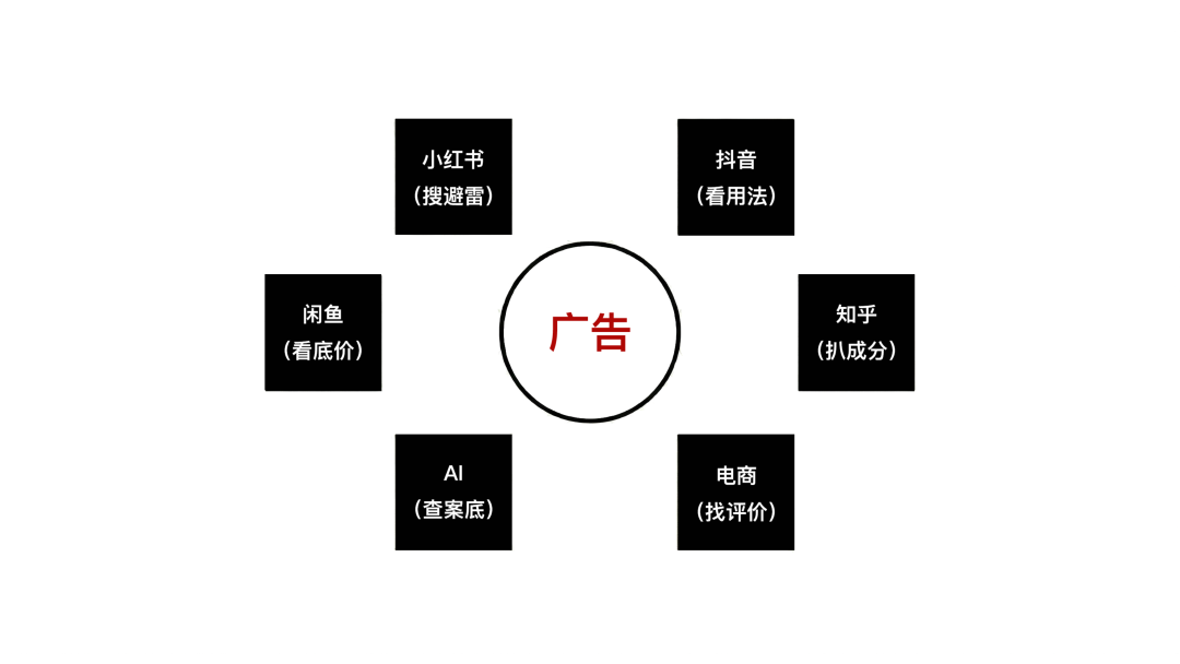 找到消费者决策对比验证的路径,抢占第一解释权。我之前《消费品品牌营销就是两场相遇?》这篇文章说让人和货的相遇,分为媒介场和信息场,这样就特别好做验证内容运营。把自己当成一个多疑的用户,去搜一遍你的品牌。用什么词搜?相关的联想词是什么?第一页会出现什么?知乎上的高赞回答是什么?抖音是什么?京东淘宝是什么……你要做的就是在这些必经之路上,这些能够让用户进行验证的触点上,提前把你的证据铺好。别等着用户对你扒皮,你做好自己把底牌亮在他们眼皮子底下。