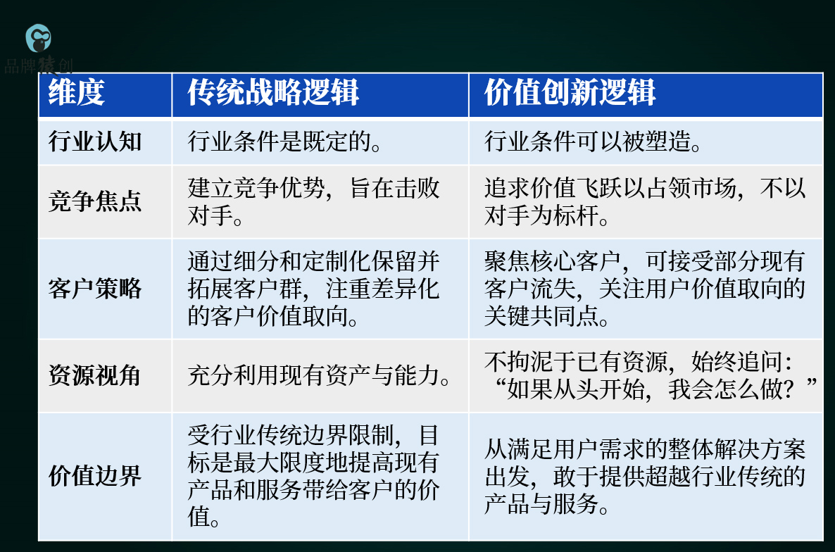 接下来,说一说传统竞争逻辑与价值创新逻辑在战略思维上的本质区别。这些差异,直接决定了我们提出怎样的问题、发现怎样的机会,乃至以何种方式理解风险。下面从五个维度对二者进行对比: