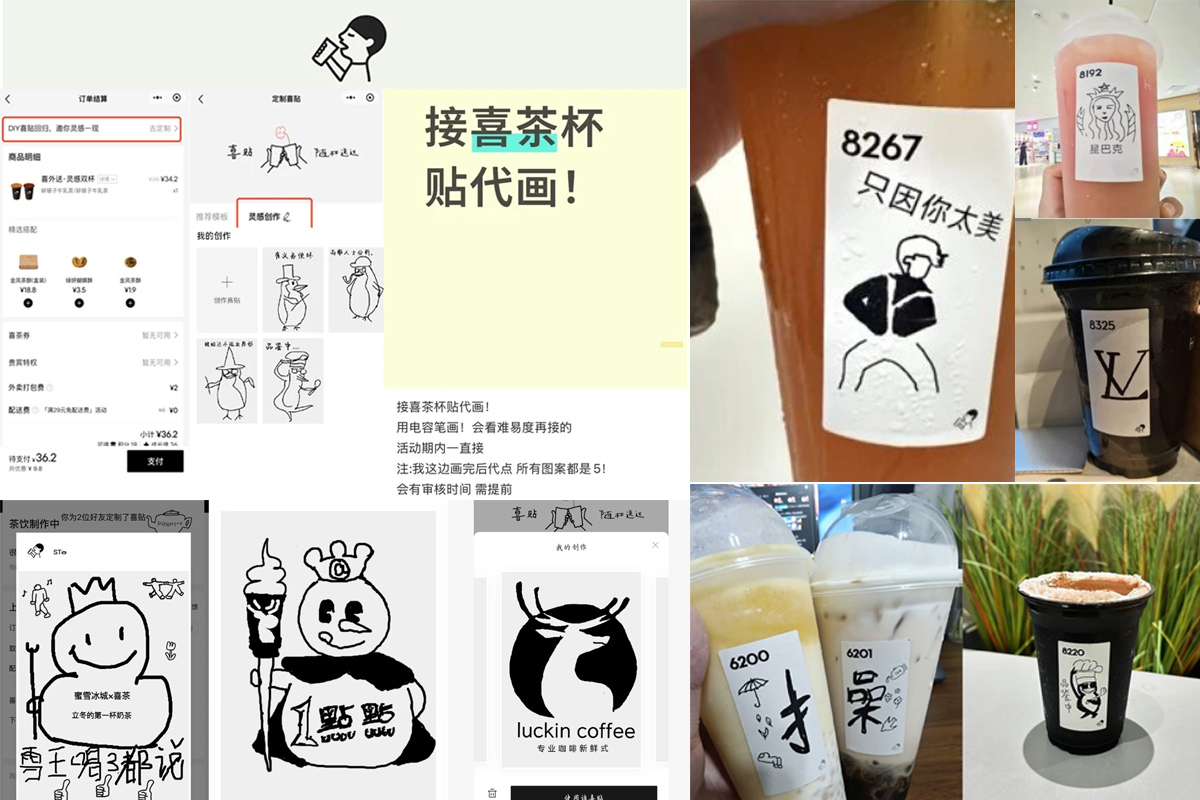 2025年走红的喜茶「DIY 喜贴」,便是最好的例证。品牌将杯贴设计权开放给用户,零门槛创作催生出表白、祝福、段子、插画等多元表达,一杯茶饮就此化作流动的赛博画布。这既让喜茶回归其“灵感”内核,也让共创得以低成本出圈:以低门槛导入参与,以情感联结促发传播,并将规则的不确定性,转化为互动中的趣味。