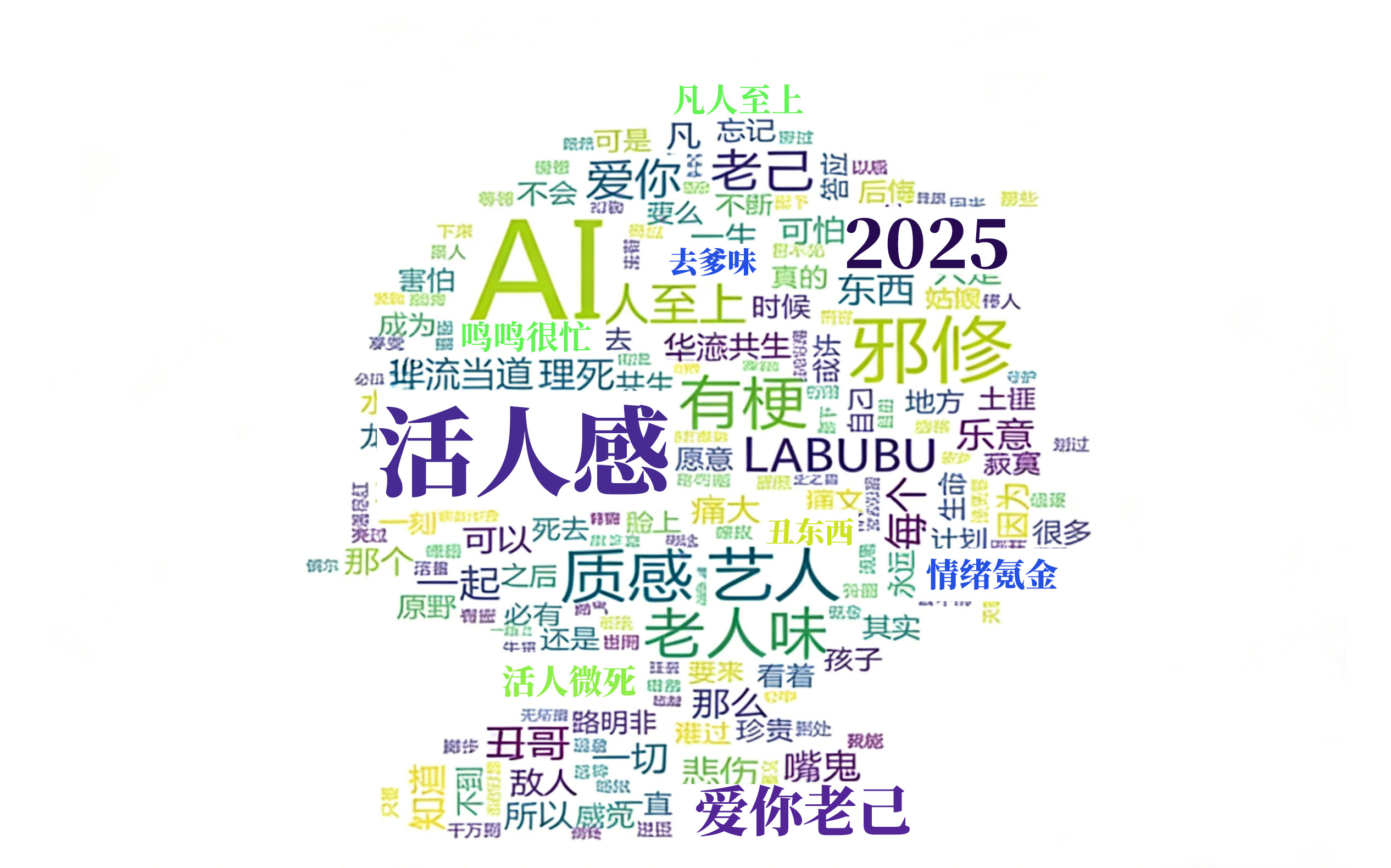 活人感、爱你老己、凡人至上、AI、邪修、华流当道、理感共生、有梗、乐意、痛文化、质感艺人、老人味、LABUBU、情绪氪金、情绪嘴替、来都来了、丑东西、死了么、活人微死……