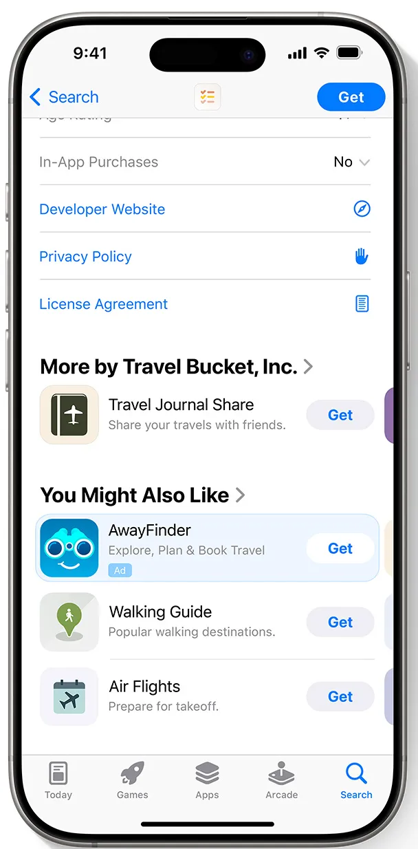 当用户浏览其他应用(尤其是同类或竞品应用)的产品页并滚动到底部时,广告可以出现在“你可能也喜欢”(You Might Also Like) 列表的顶部。