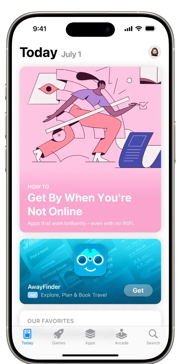 “今天”标签页是 App Store 的“首页”,也是超过 5 亿用户每周开启他们应用发现之旅的第一站。在此处投放广告,应用将获得强大的品牌曝光。