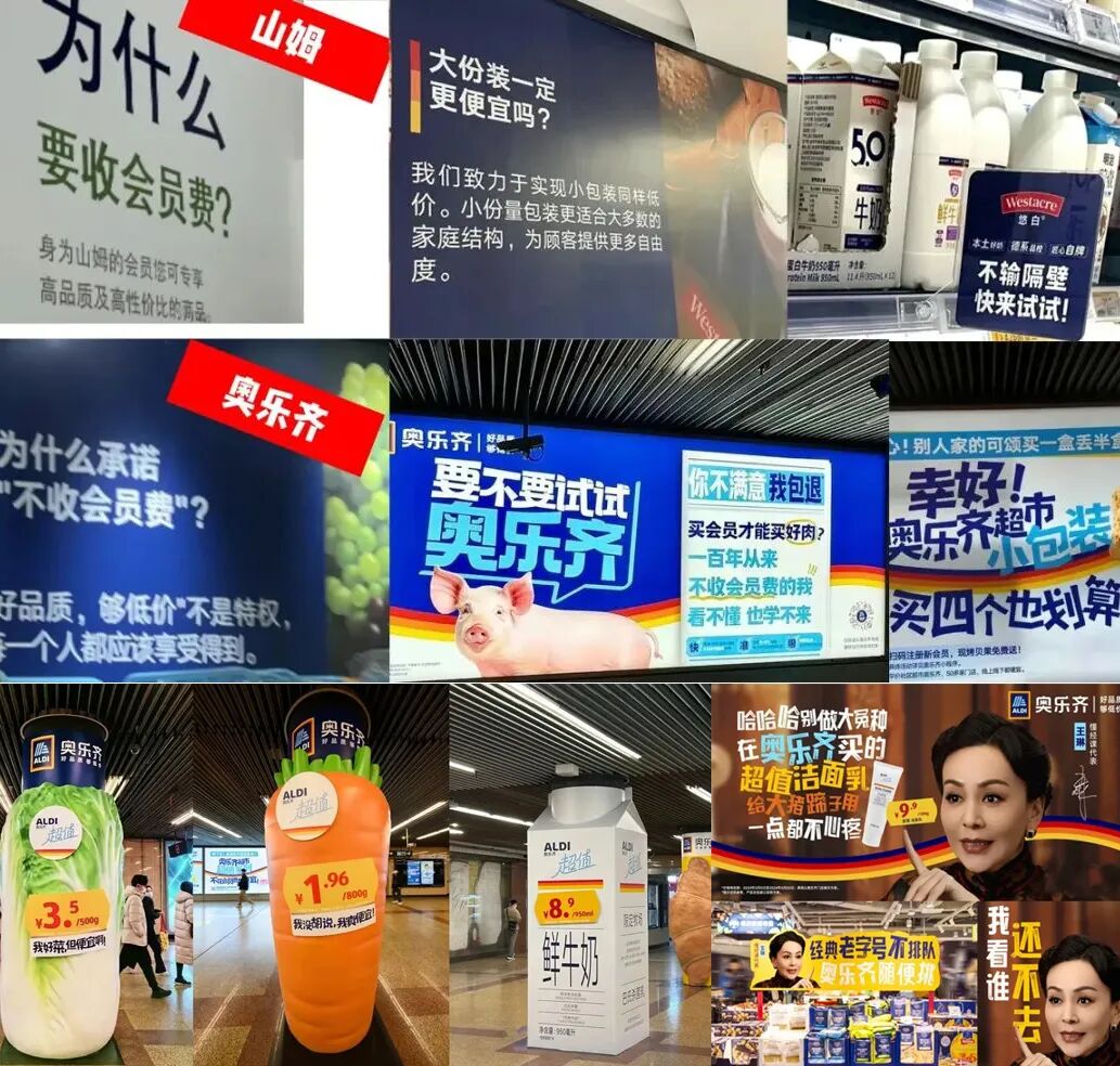 比如,在苏州、无锡开设首店时,直接在山姆停车场门口设置广告牌,巧妙“吐槽”其大包装浪费、需缴纳会员费的痛点,既打出了自身差异化优势,又显得亲切有趣。