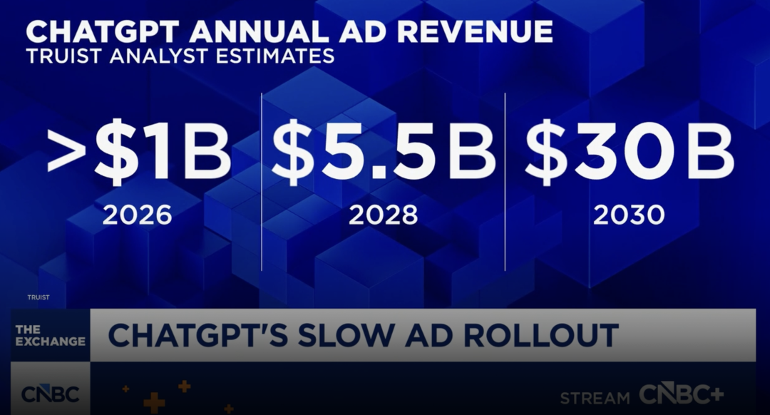 - 美国投行Truist预计OpenAI广告收入到2030年将增长至300亿美元以上。