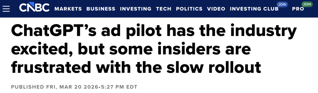 CNBC撰文称ChatGPT广告试水进展缓慢