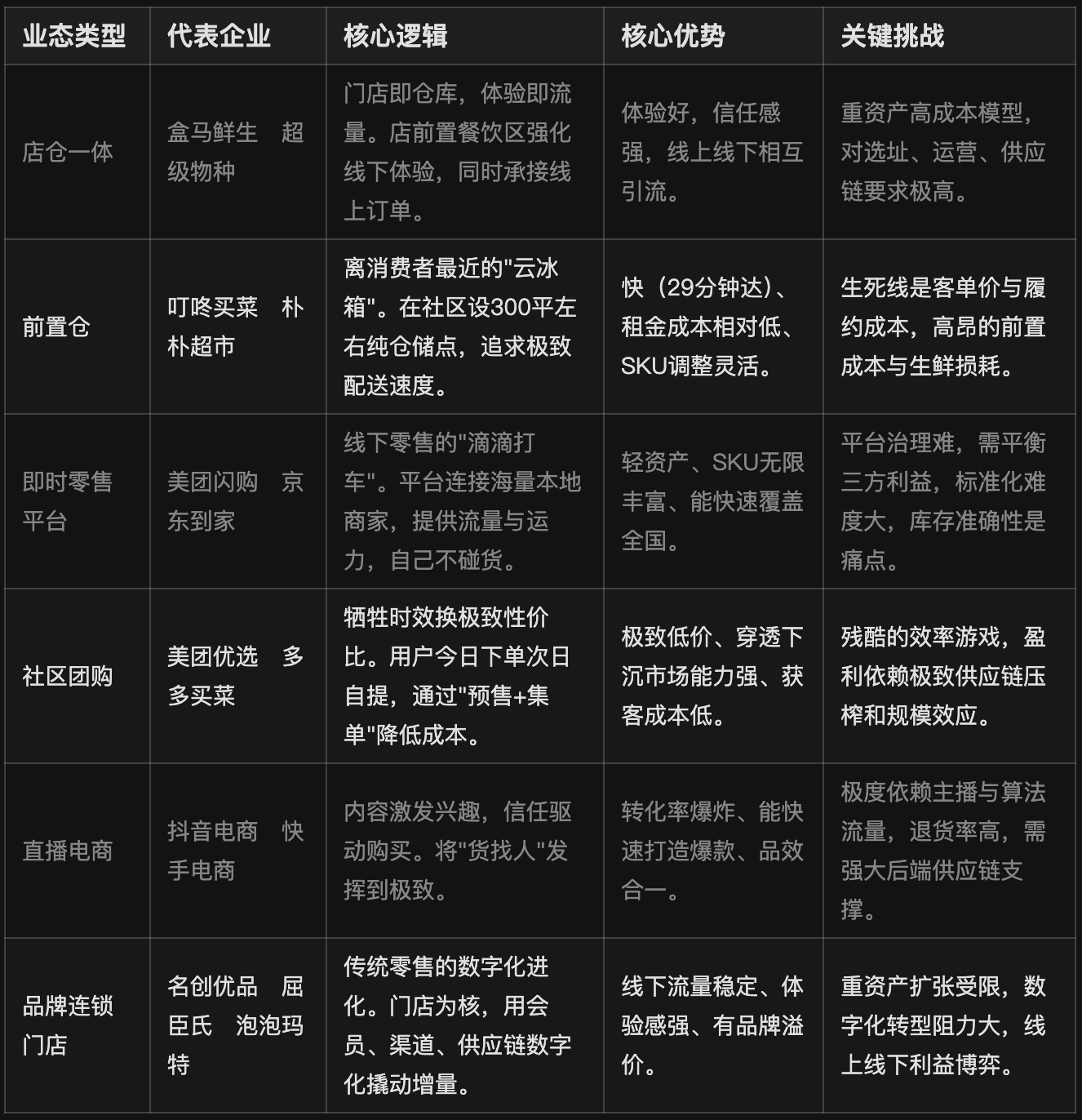 新零售并非单一模式,而是在”体验、速度、成本、丰富度”四个维度上寻求不同平衡的物种演化。其中,前五种是”原生新零售”(履约方式创新),第六种是”传统零售的数字化升级”(运营效率提升)。