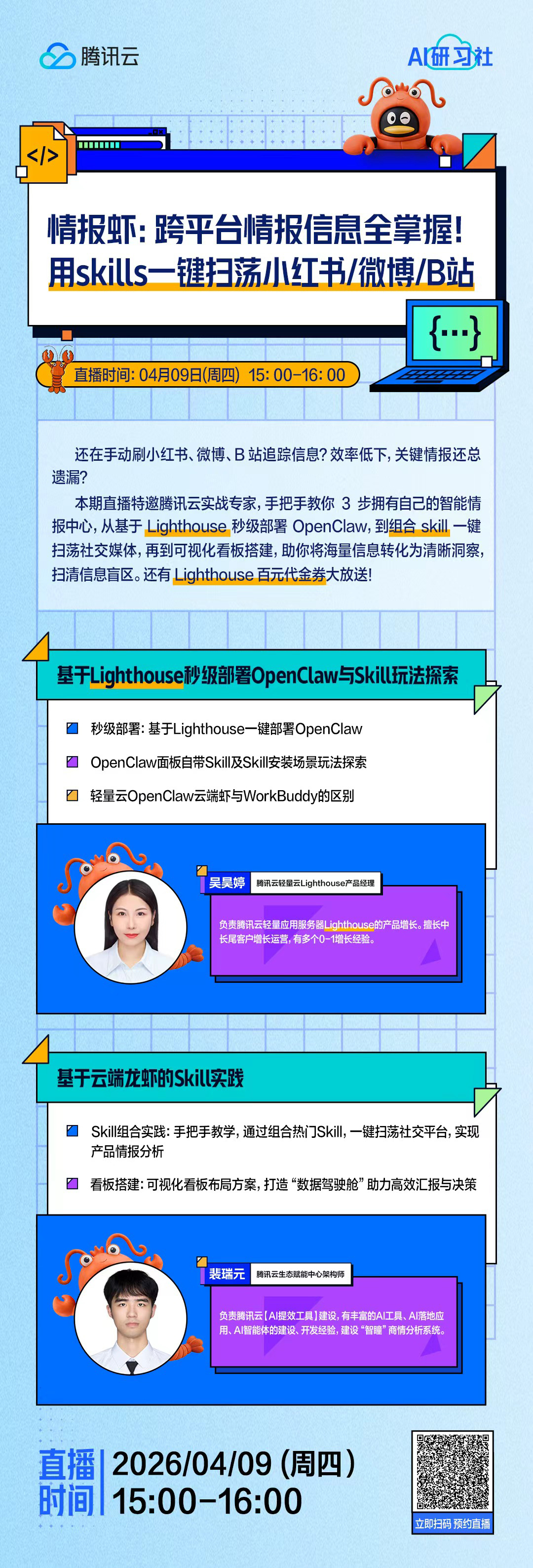 本期直播特邀腾讯云实战专家,手把手教你3步拥有自己的智能情报中心,从基于Lighthouse秒级部署OpenClaw,到组合skill一键扫荡社交媒体,再到可视化看板搭建,助你将海量信息转化为清晰洞察,扫清信息盲区。还有Lighthouse百元代金券大放送!