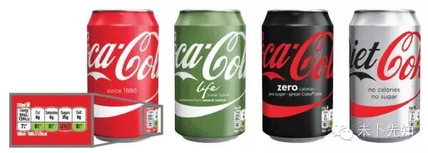 可口可乐(英国)统一了四类可乐的包装设计。但是在颜色上加以区分:Coca Cola:红色;Coca Cola Zero:黑色;Diet Coke:银色;Coca Cola Life:绿色。