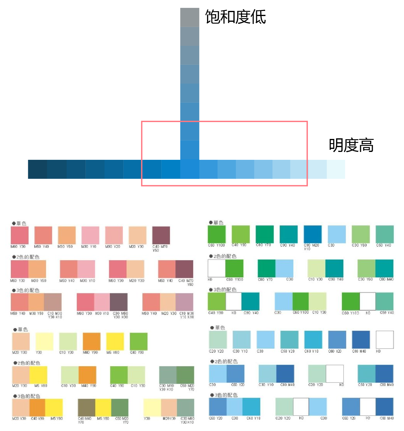 如图,饱和度高的要比饱和度低的轻,明度高的要比明度低的轻。根据这种颜色的轻重规律,我们会发现红色框选区域里的色彩相对明亮柔和,视觉呈现上更加轻盈,给人一种舒适的感觉。掌握了这一原则,对于配色”轻“也就更易实现了。小编在此也给大家挑选了几组明快柔和的色调搭配,当你遇到长篇大论型的文章时不妨试试。