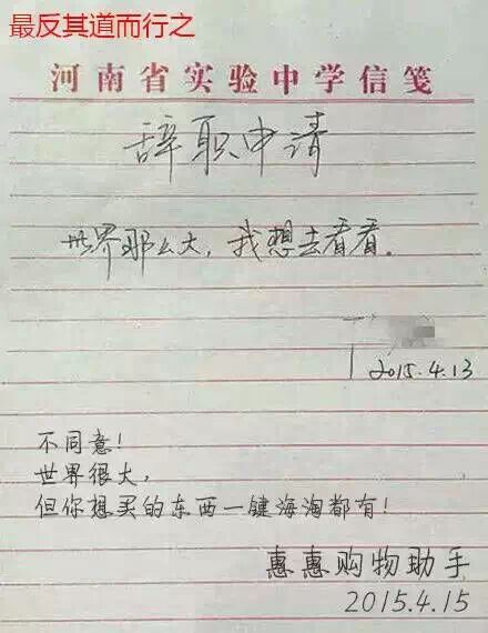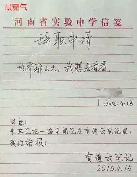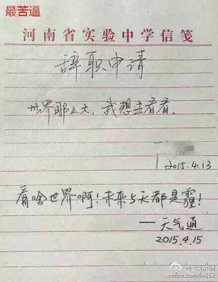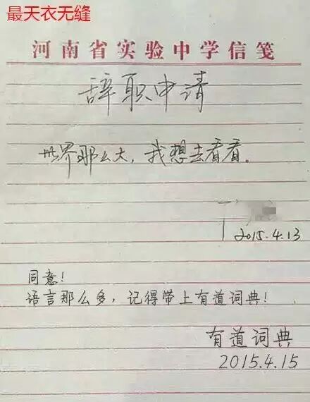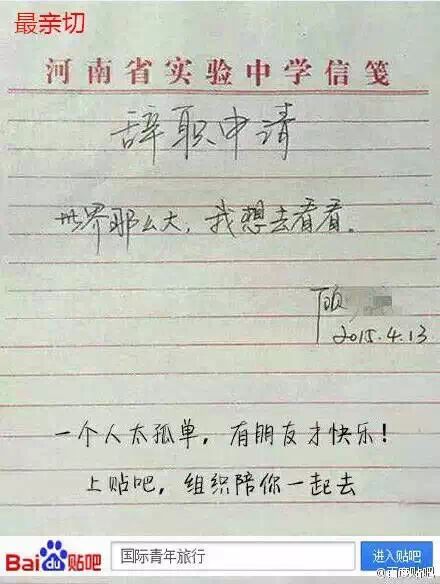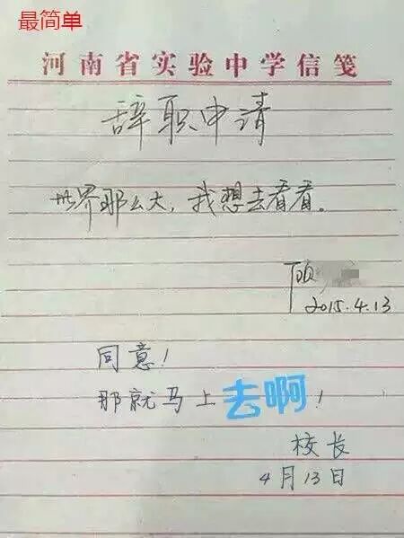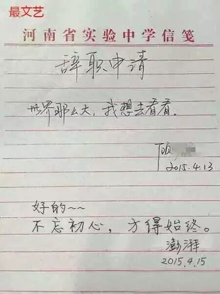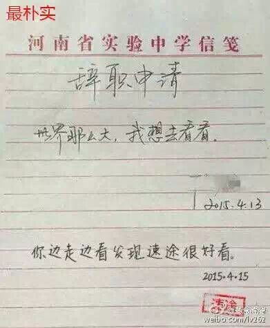我们先看看原版,一句“世界那么大,我想去看看”,简单,有力,很有广告语的感觉,不知道这位老师的申请批准了吗,不知道他是不是一位语文老师,为情怀点赞!