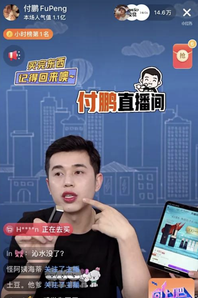 2020年10月21日,付鹏在小红书开启自己个人的直播带货首秀,小红书官方战报显示,付鹏首播人气值达到2亿,累计观看人数74万。二播销售额突破2000万,创下小红书单场直播记录。