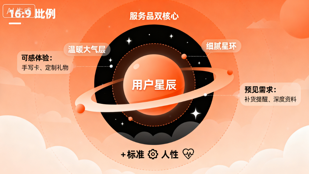 服务品的本质,从来不是问题的解答,不是机械的”收到,马上处理”。它是包裹着品牌星球的 温暖大气层 ,是抵御商业宇宙严寒的天然屏障;它也是环绕每颗用户星辰的 细腻星环 ,一个既亲密又保有尊重的能量场域。