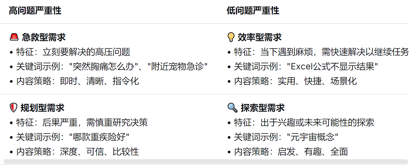 判定需求紧急度不是为了学术研究,而是为了指导资源分配和内容策略。对高紧急度需求,我们的内容必须像”急救手册”一样,直接回答问题,提供明确的下一步;而对低紧急度需求,我们可以提供更全面、更深入的内容,逐步建立专业形象和用户信任。