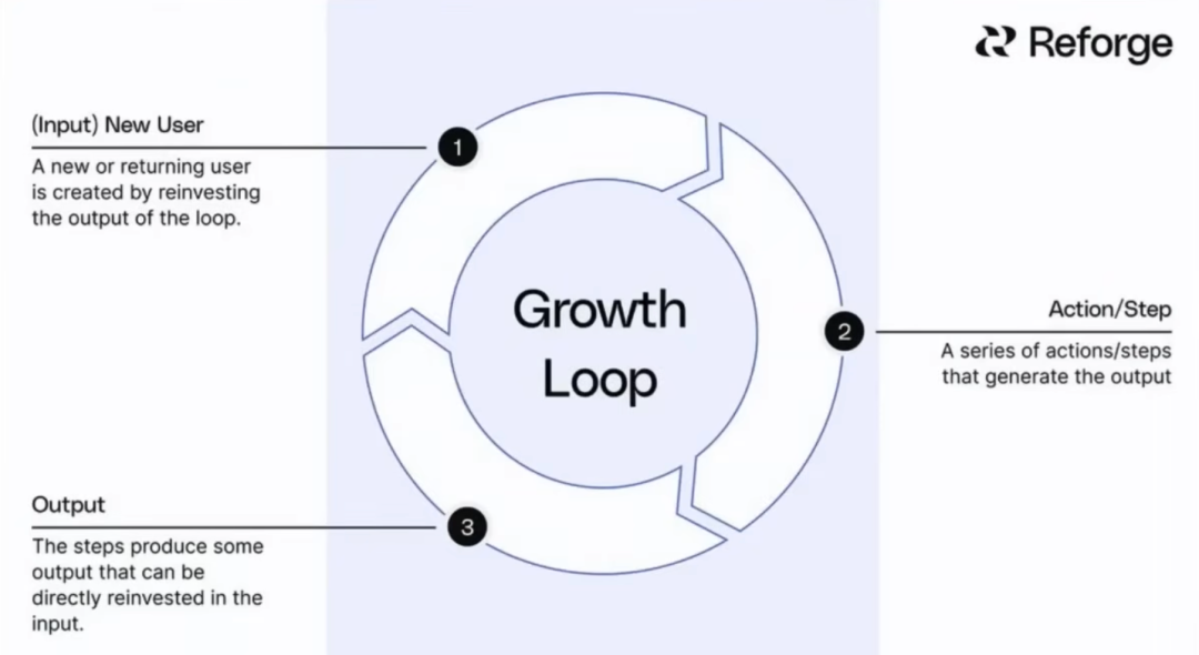 更重要的是,Elena 提出了一个我觉得特别精准的概念:最快速增长的公司都不是通过漏斗 (funnel) 成长的,而是通过循环 (loop) 成长的。她甚至半开玩笑地说漏斗是”F 开头的脏话”,应该尽量避免使用。循环的逻辑非常简单:有一个输入,比如新用户,他们在产品中执行某个动作,产生一个输出,这个输出又可以被再投资来产生下一个输入。这就形成了一个复利飞轮,不断自我强化。