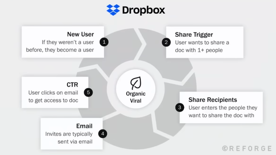 她举了 Dropbox 的例子,特别让我印象深刻。Dropbox 早期有一个病毒式循环:给存储空间换取存储空间。这个简单的机制让 Dropbox 几乎没花什么营销费用就达到了第一个 10 亿美元的里程碑。而现在,Dropbox 60% 的新用户获取来自产品循环,不是来自市场部门,也不是来自销售团队,而是来自产品本身的设计:新用户上传内容,想要分享给别人,收到分享的人中有一定比例会注册成为新用户。这就是用户在为你做营销,而这一切的源头都是产品体验的设计。