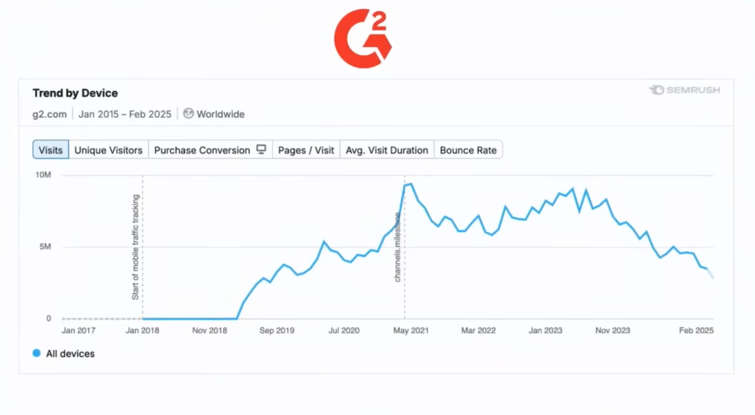 接下来 Elena 讲到了最残酷的现实:AI 正在摧毁我们的分销渠道。她展示了一个案例,G2 这家做 B2B 产品评论的公司,类似于消费领域的 Trustpilot。G2 的大部分增长来自 SEO,也就是谷歌搜索的自然流量。但从 ChatGPT 推出以来,他们的获客量下降了 80% 到 90%。这个趋势一直持续到今天,并没有好转的迹象。