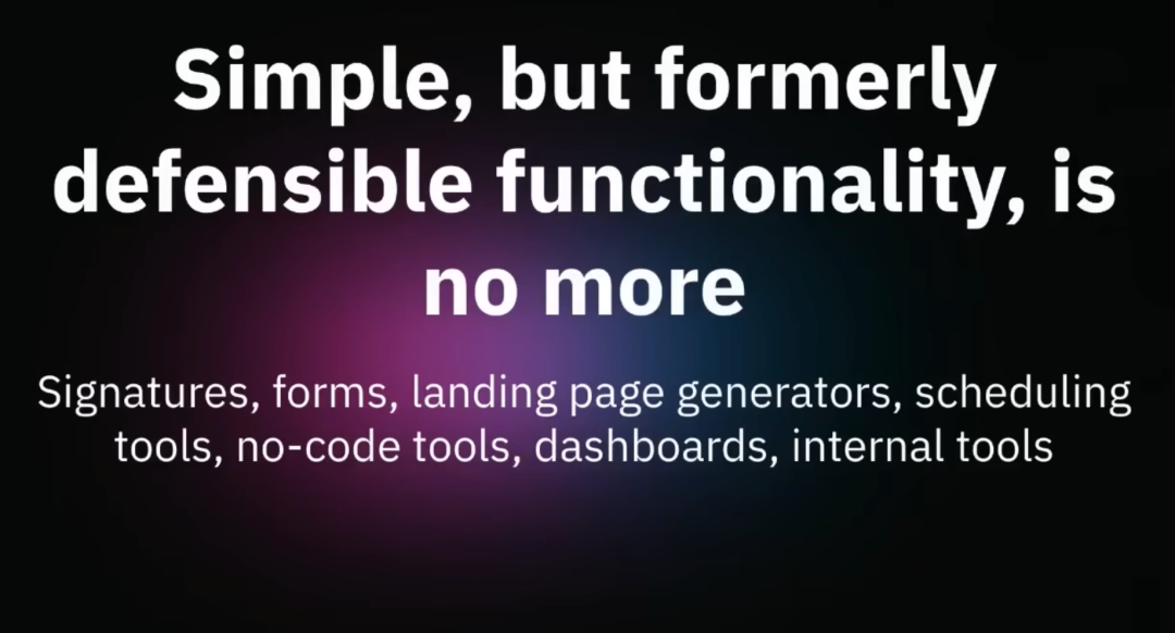 我听到这里真的感到一阵寒意。很多简单但过去看似有防御性的功能,比如电子签名、表单、落地页生成、日程安排工具、无代码工具、仪表板、内部工具,突然之间都不再具有防御性了。事实上,它们正在变成商品化的功能。商品化的门槛正在迅速提高。如果你的公司还在靠这些商品化功能赚钱,你必须尽快摆脱这个困境。