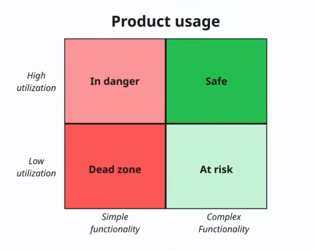 Elena 用了一个 2×2 矩阵来说明这个问题,横轴是简单功能 vs 复杂功能,纵轴是高使用率 vs 低使用率。如果你有很多复杂的、难以复制、难以用 vibe coding 做出来的功能,而且这些功能使用率很高,那你在安全区。如果你有复杂功能但使用率低,那就想办法提高使用率。但如果你有的是简单功能,而这些简单功能恰恰是被高频使用的,那你必须重新思考产品策略了。