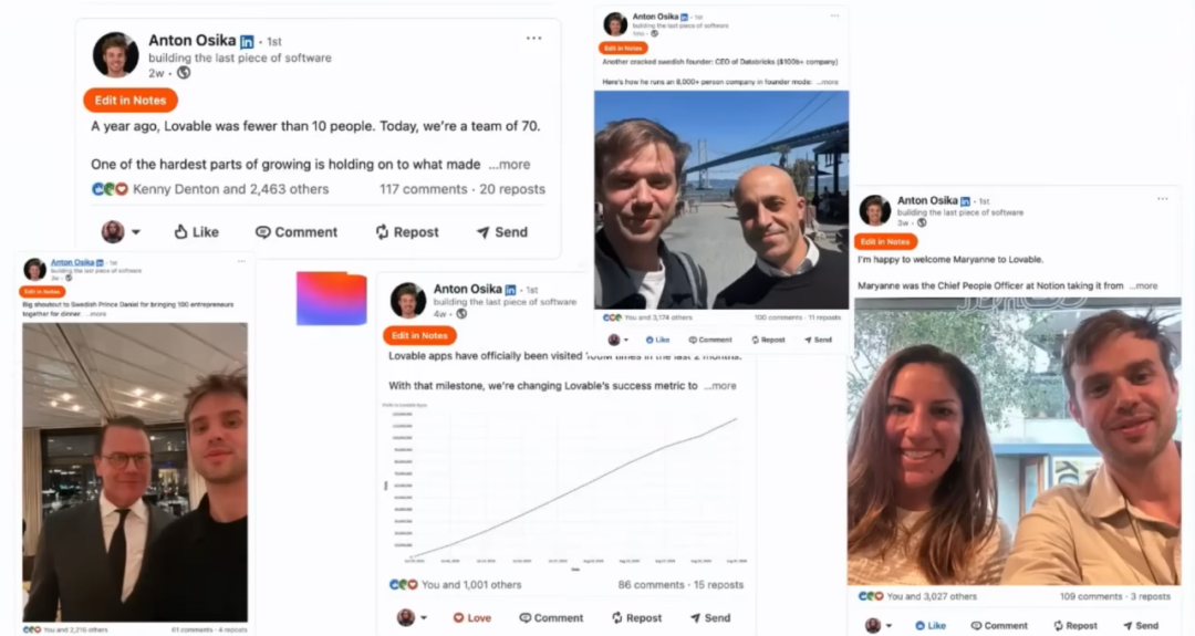第六个策略对大公司来说非常不舒服:创始人社交媒体和员工社交媒体。在人性层面与客户建立连接,让客户知道公司背后是谁,这变得比以往任何时候都重要。Lovable 的 CEO Anton 在 LinkedIn 和 X 上发帖。10 个月前他刚开始时几乎没有关注者,没有任何影响力。现在他几乎所有的帖子都能获得 2000+ 的互动和数十万甚至上百万的展示,而且是免费的、自然的流量。这是市场人员梦寐以求的效果,但你可以用自己的团队创造出来。