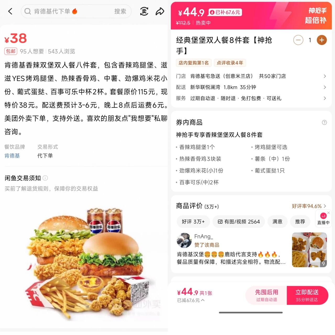 如今,为了更便宜吃肯德基,不少消费者选择找人代下单,官方小程序上 42 元的滋滋 yes 烤鸡腿堡三件套,代下单仅需 18.9 元,美团 44.9 元的双人餐代下单能再省 6.9 元,背后是代下单卖家通过回收大神卡、银行积分券等优惠,拆分叠加形成价格优势,甚至形成了优惠券回收、搭配的成熟产业链。