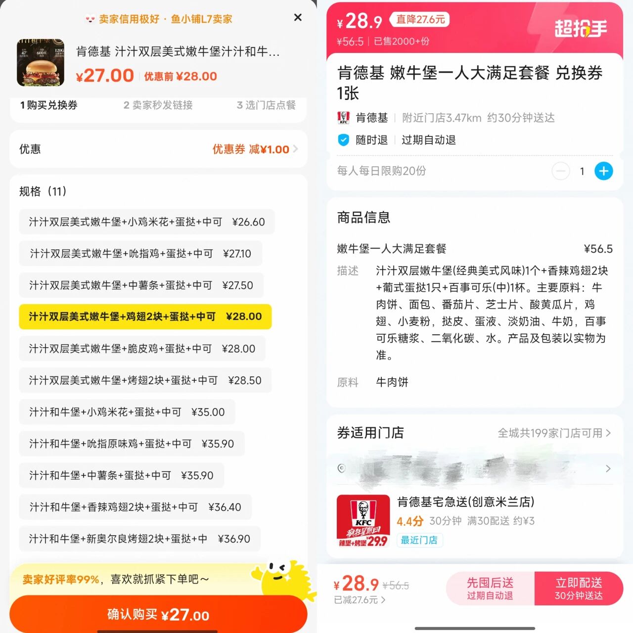 另一边,在淘宝超抢手页面,肯德基嫩牛堡大满足套餐,售价28.9元;同款代下单优惠价27元,比淘宝便宜了1.9元。