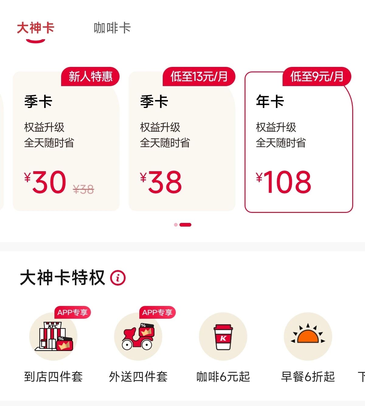 其一,是从肯德基官方获取优惠。比如,购买肯德基大神卡的消费者,可以享受6元咖啡、6折早餐、满额免配送费等优惠;在肯德基小程序上,普通消费者也有机会获得,29.9元六个蛋挞、指定饮品买一送一等福利。