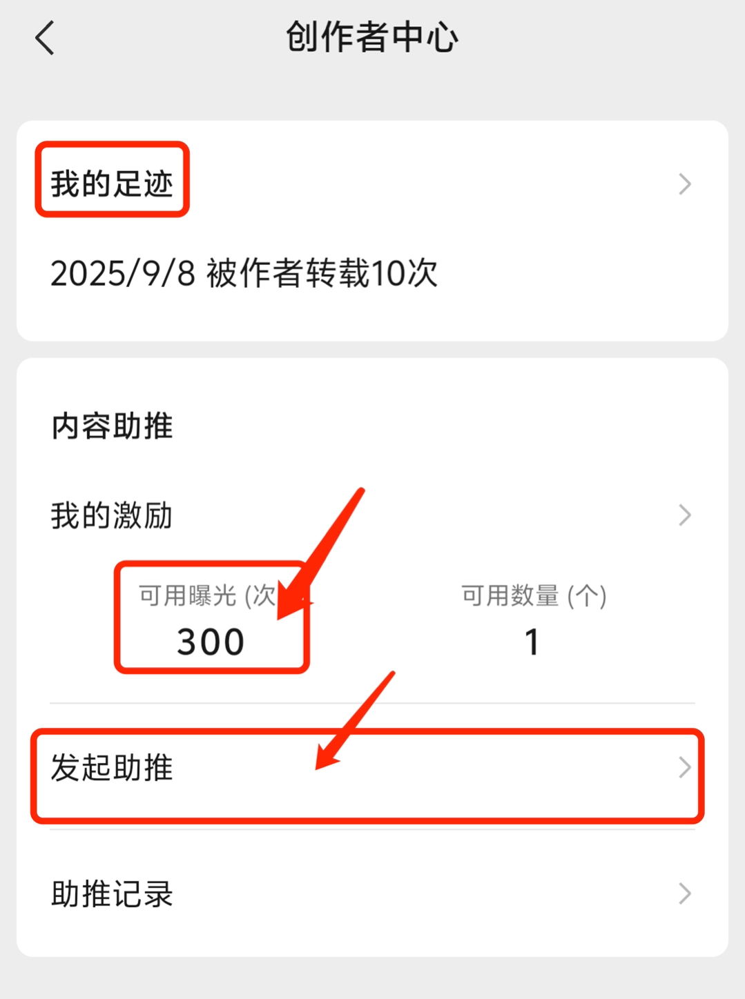 图1(以我个人帐号为例):内容助推&我的足迹(显示可曝光次数)