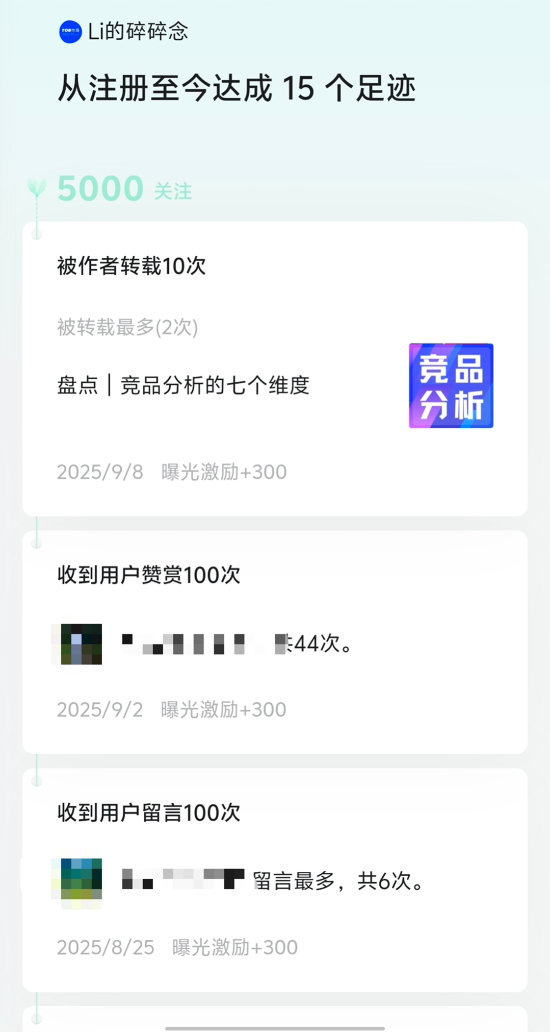 被用户分享(10次、50次、100次、500次)、被用户收藏(10次、50次、100次)、接收留言量(5次、10次、50次、100次)、内容划线量(5次、10次、50次)等互动行为,每次达标可获得300曝光,推动创作者与读者建立高频连接。