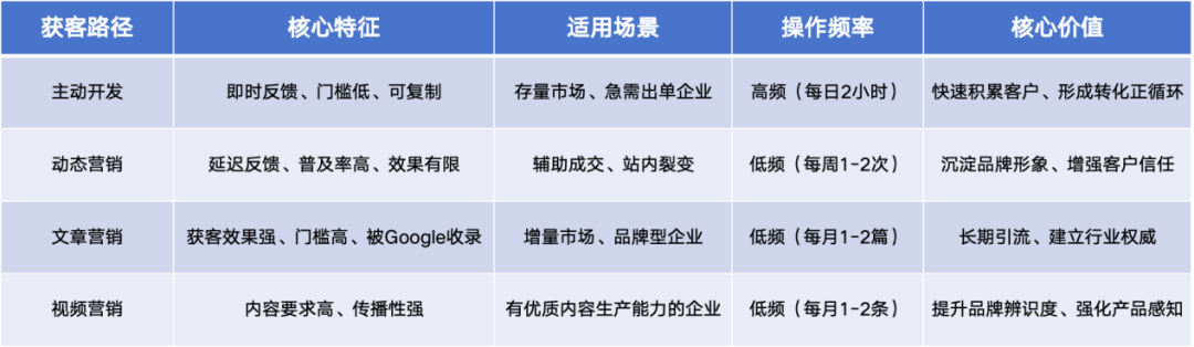 核心观点:优先聚焦主动开发对于绝大多数出海企业而言,主动开发/拓客一定是RIO最高的选择。