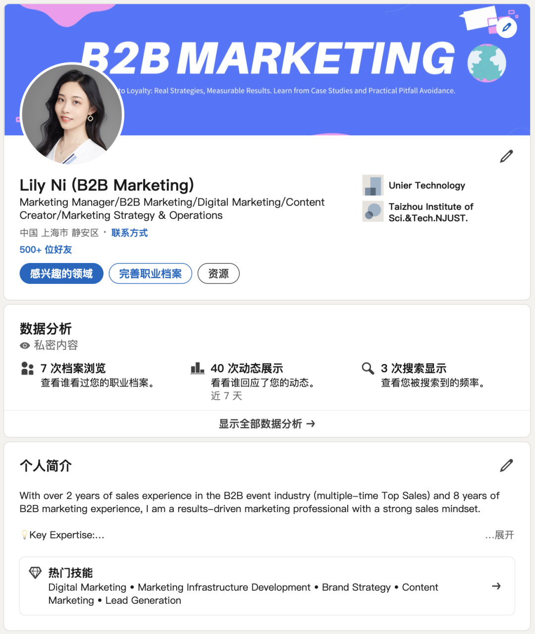 - 在个人简介中合理植入关键词,需要避免生硬堆砌。可在“姓”字段后用英文输入法添加核心关键词(例如,Lily Ni (B2B Marketing),注意中英文输入法),提升搜索精准度;